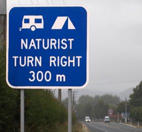 This is one of the few explicit road signs on a main highway to 'Katikati Naturist Park' in Wharawhara Road, just 3 km from Katikati on SH 2. (Note that there are a few 'standard AA' type signs near some local clubs, but they are quite often obscure references just to initials, or the names of the grounds which are not publicly recognised.) .