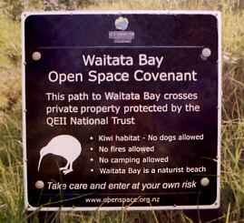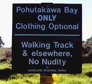 This is a rare result! It's due to having a Naturist-friendly developer, in this case. This notice is at the beginning of the track to 'Waitata Bay' which is just 2km from Russell, in the Bay of Islands. (The property owner insisted both on the notice and its wording, as a condition of putting the beach into the QEII National Trust. Note the last of the 4 'bullet points'.) .