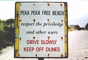 It's evident that this sign has been there for a while... What isn't clear though, is that most Naturists now go about 1 km north to access the area from Te Hapua Rd (off SH 1); rather than from Peka Peka Rd, where this sign is. It faces the beach, not the road.