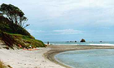 As well as the popular Uretiti Beach, Kauri Mountain Beach is an option for those around Whangarei. (It is the north end of Whangarei's uninterrupted Ocean Beach - next, below). Once over the mouth of this creek (dicey when the tide's in, as here), there's an optional 10km walk to the other end available!